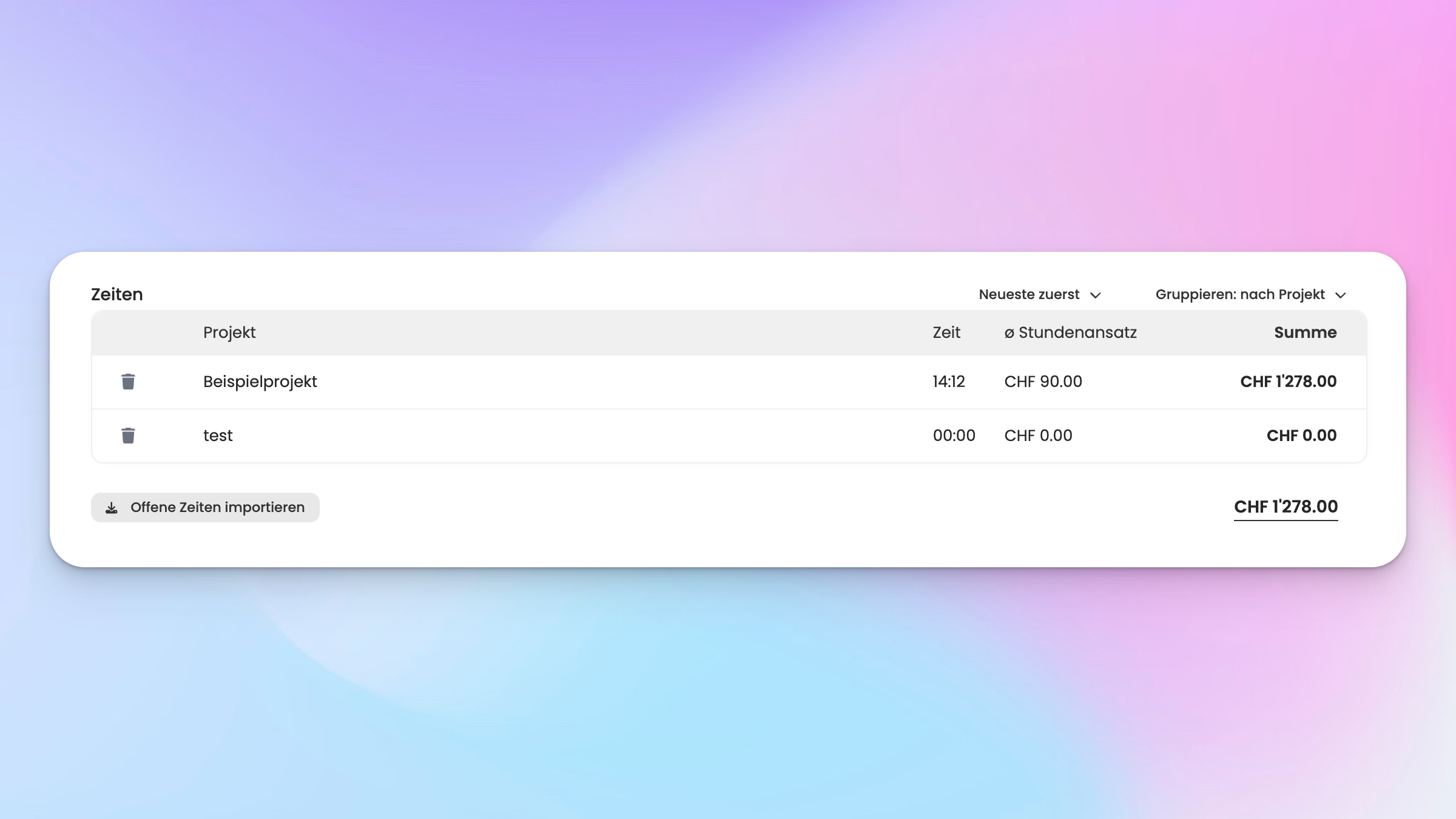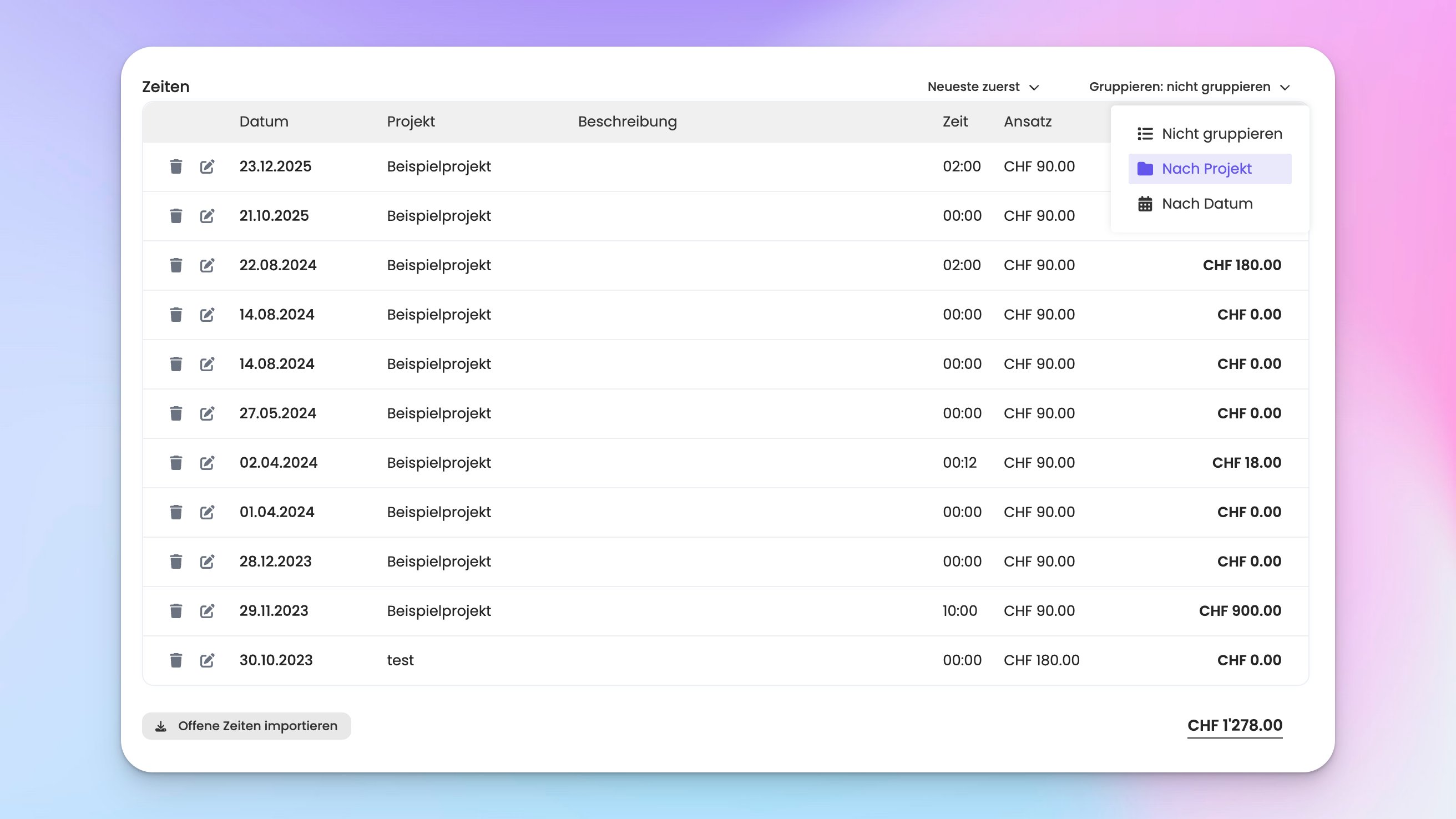 Du kannst deine Zeiten auch nach Projekt sortieren. Wähle dafür die Option «Nach Projekt» bei der Auswahl «Gruppieren»: