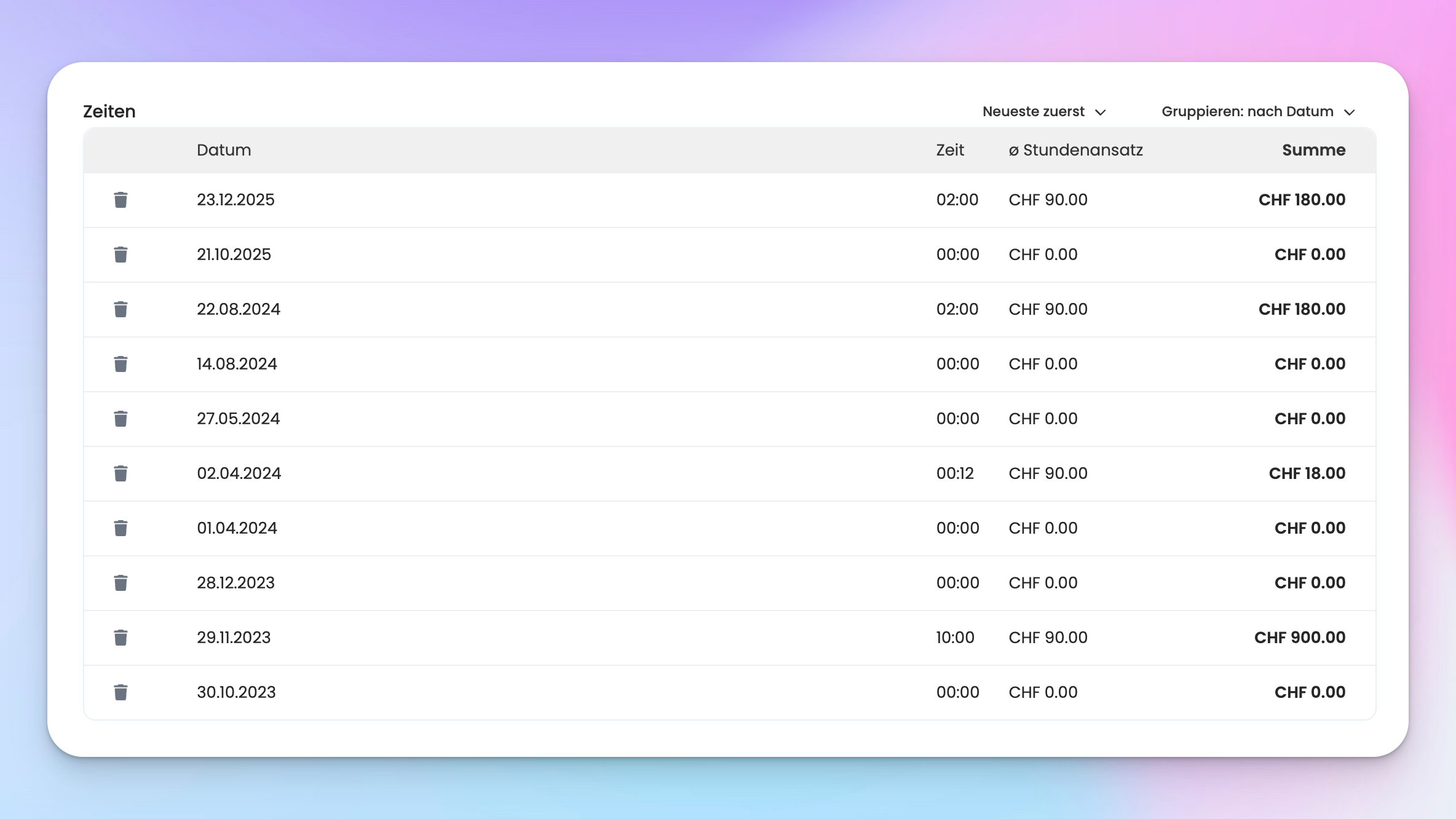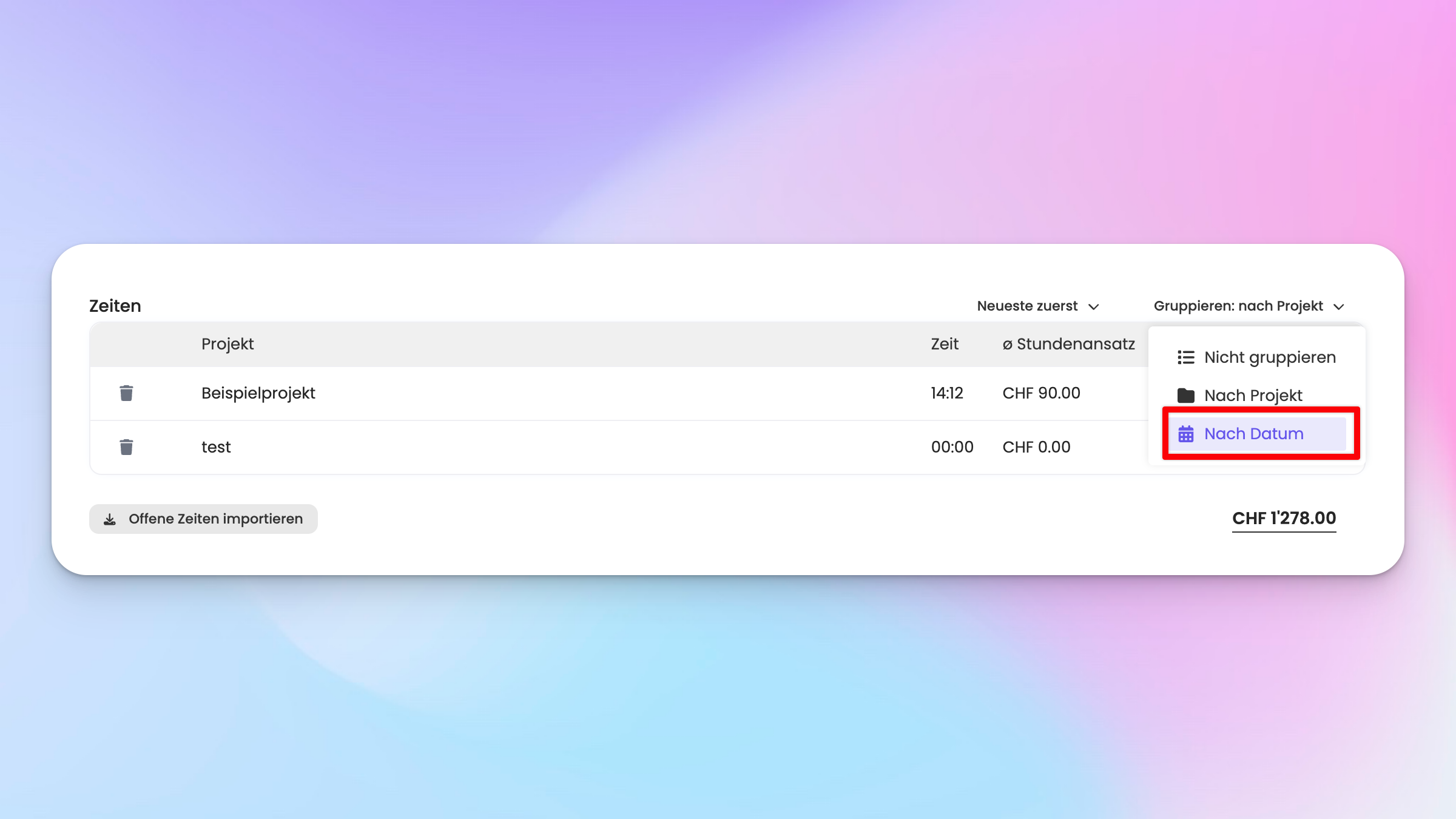 Du kannst deine Zeiten auch nach Datum sortieren. Wähle dafür die Option «Nach Datum» bei der Auswahl «Gruppieren»: