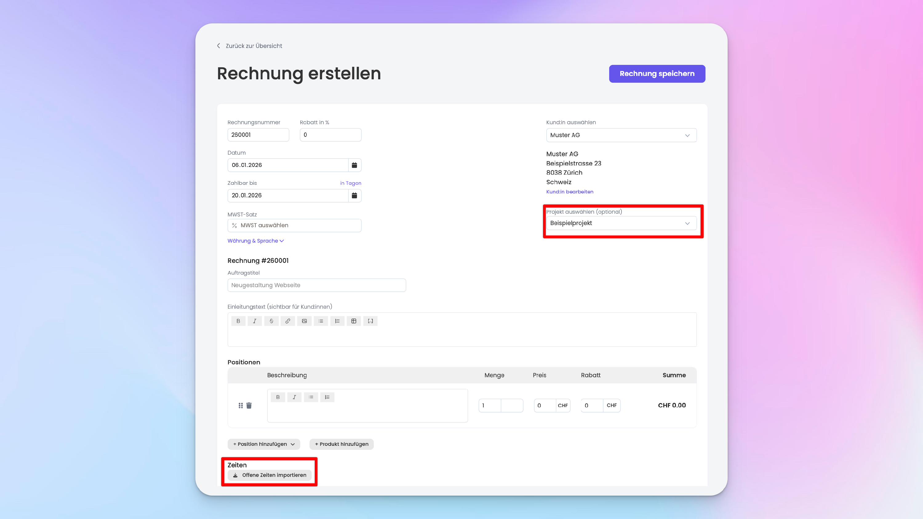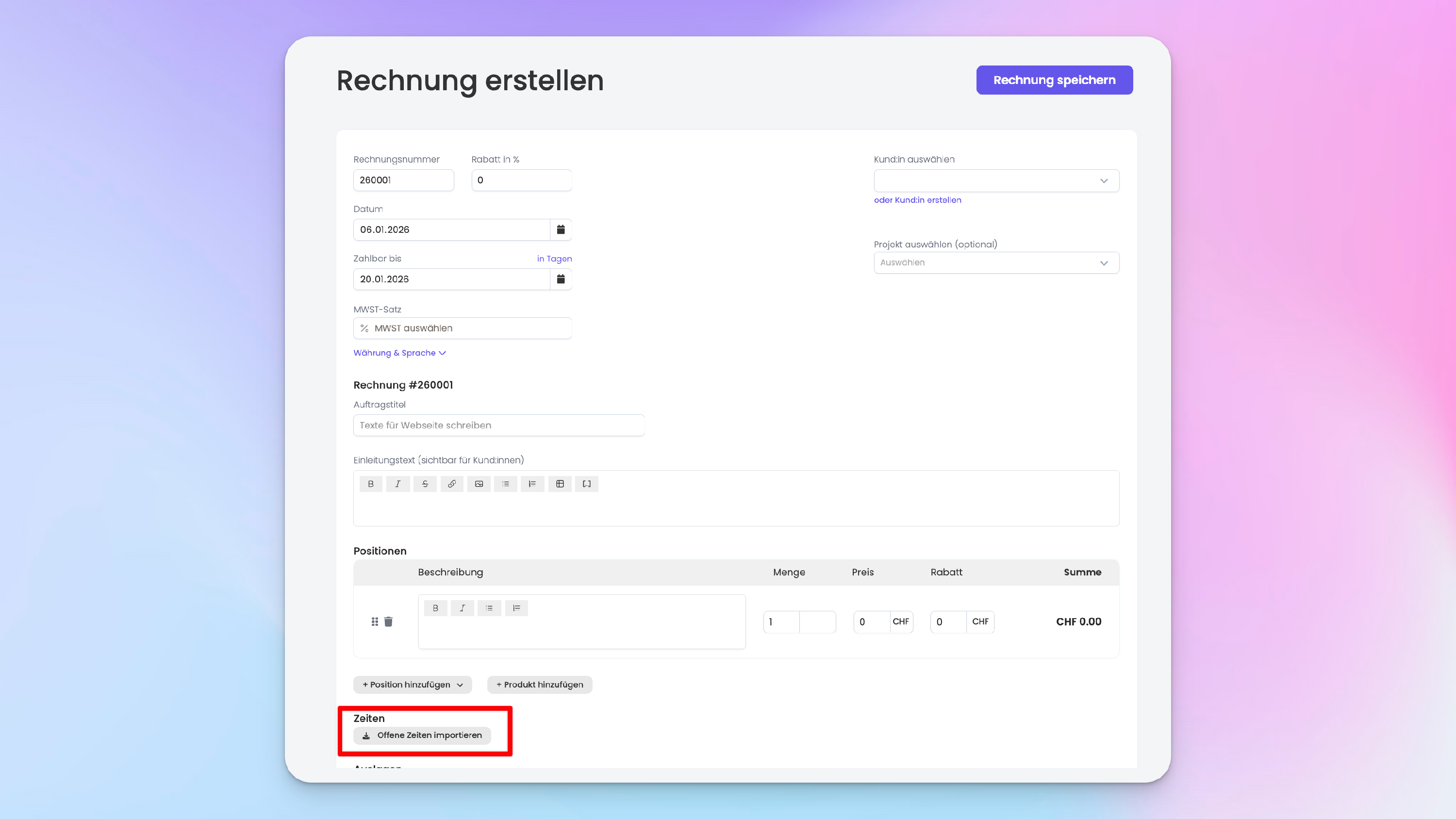 Um die Zeiten zu importieren, erstelle eine neue Rechnung oder bearbeite eine bestehende Rechnung, wähle eine:n Kund:in aus und klicke anschliessend auf «Zeiten importieren».