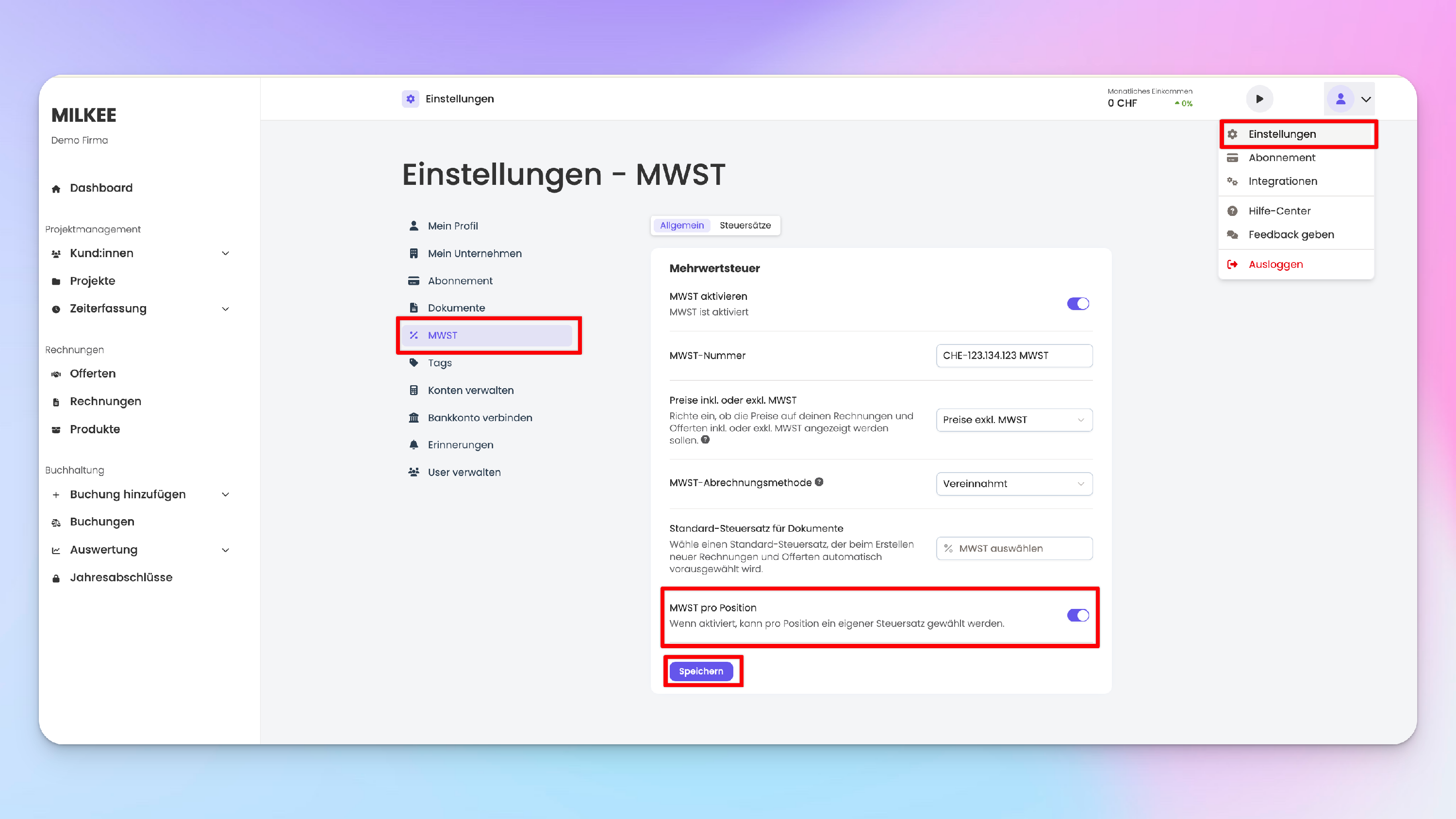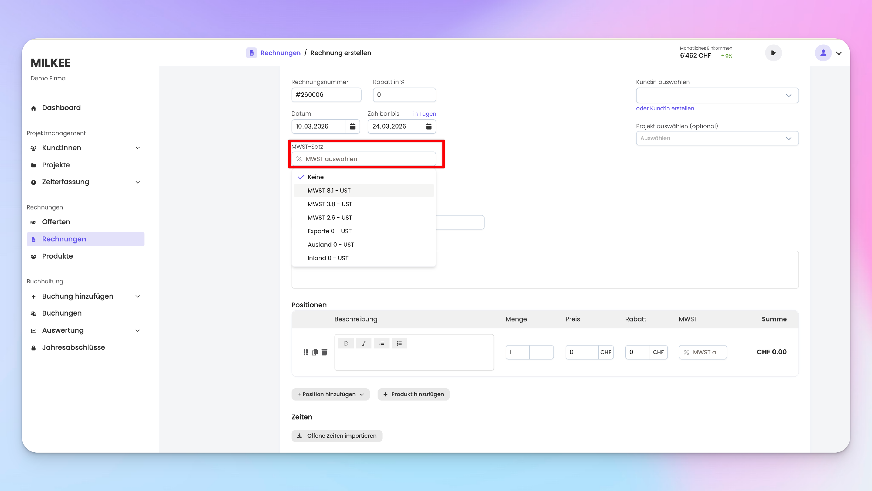 In MILKEE hast du die Option, pro Position einen MWST-Satz anzugeben. Diese Funktion muss aktiviert werden. Wenn du die Funktion nicht aktivierst, kannst du pro Rechnung oder Offerte nur einen einzelnen MWST-Satz auswählen.
