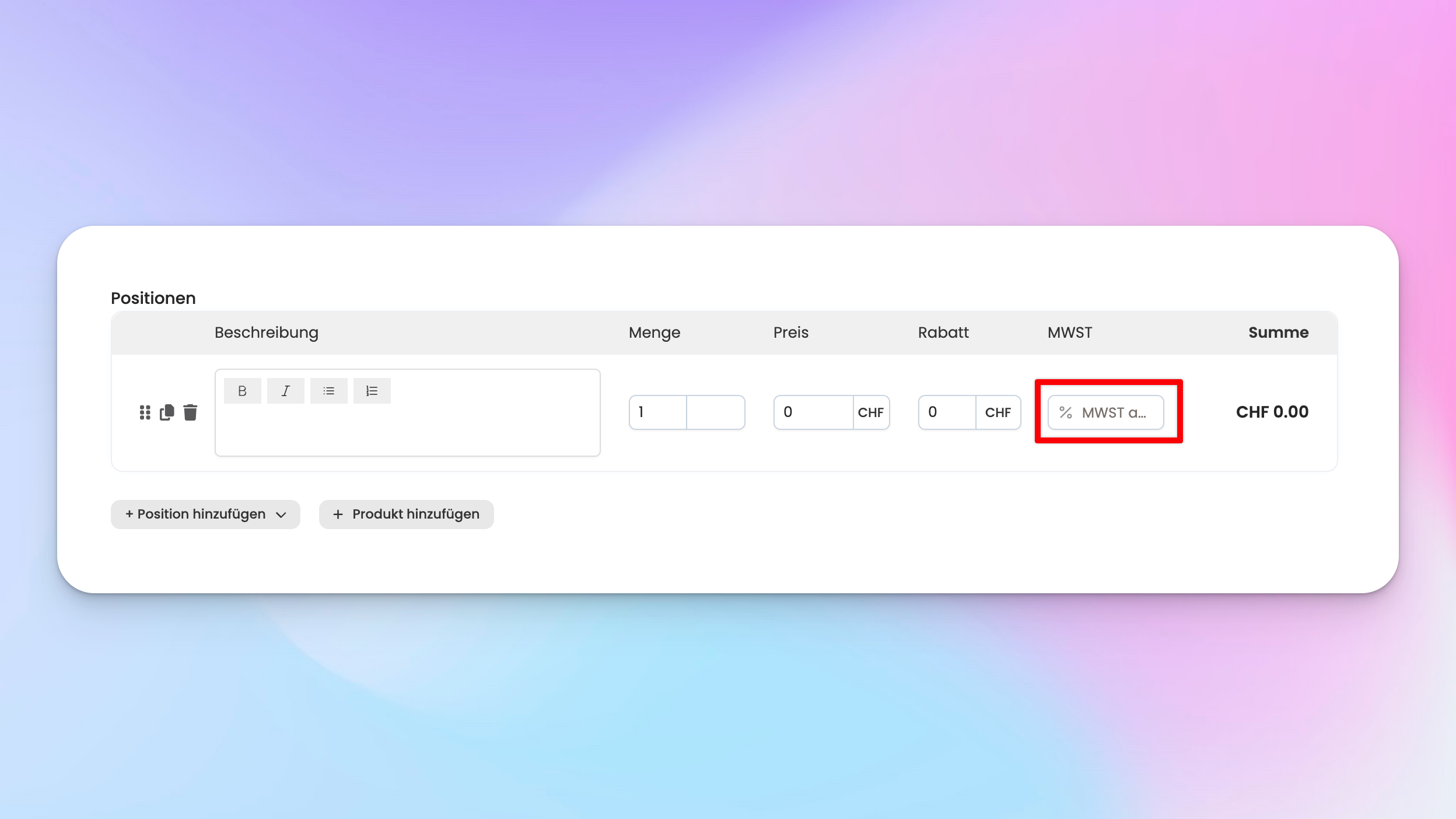 Du kannst dann beim Erstellen der Positionen den MWST-Satz auswählen: