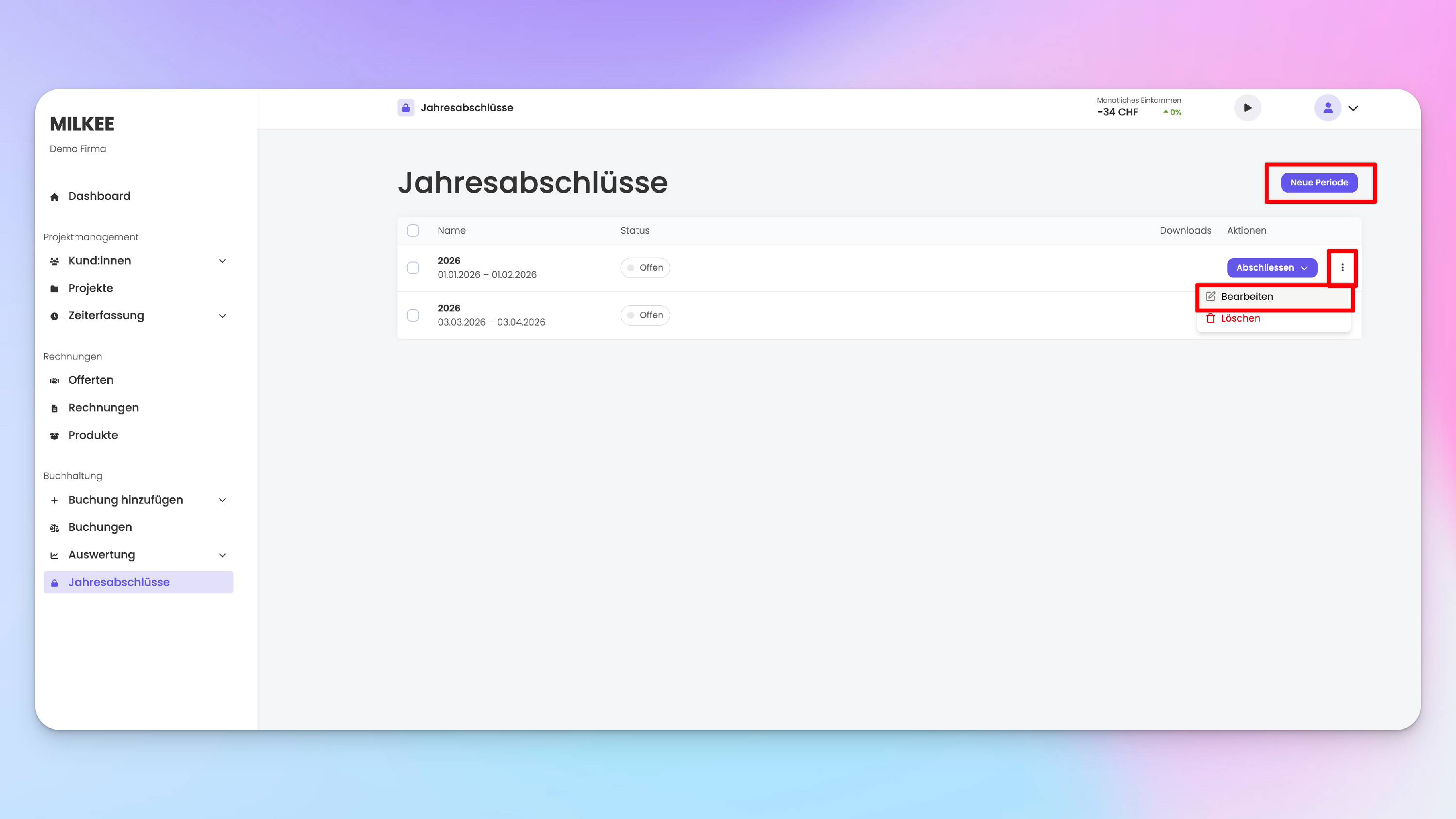 Erstelle oder bearbeite den gewünschten Zeitraum unter «Jahresabschlüsse»: