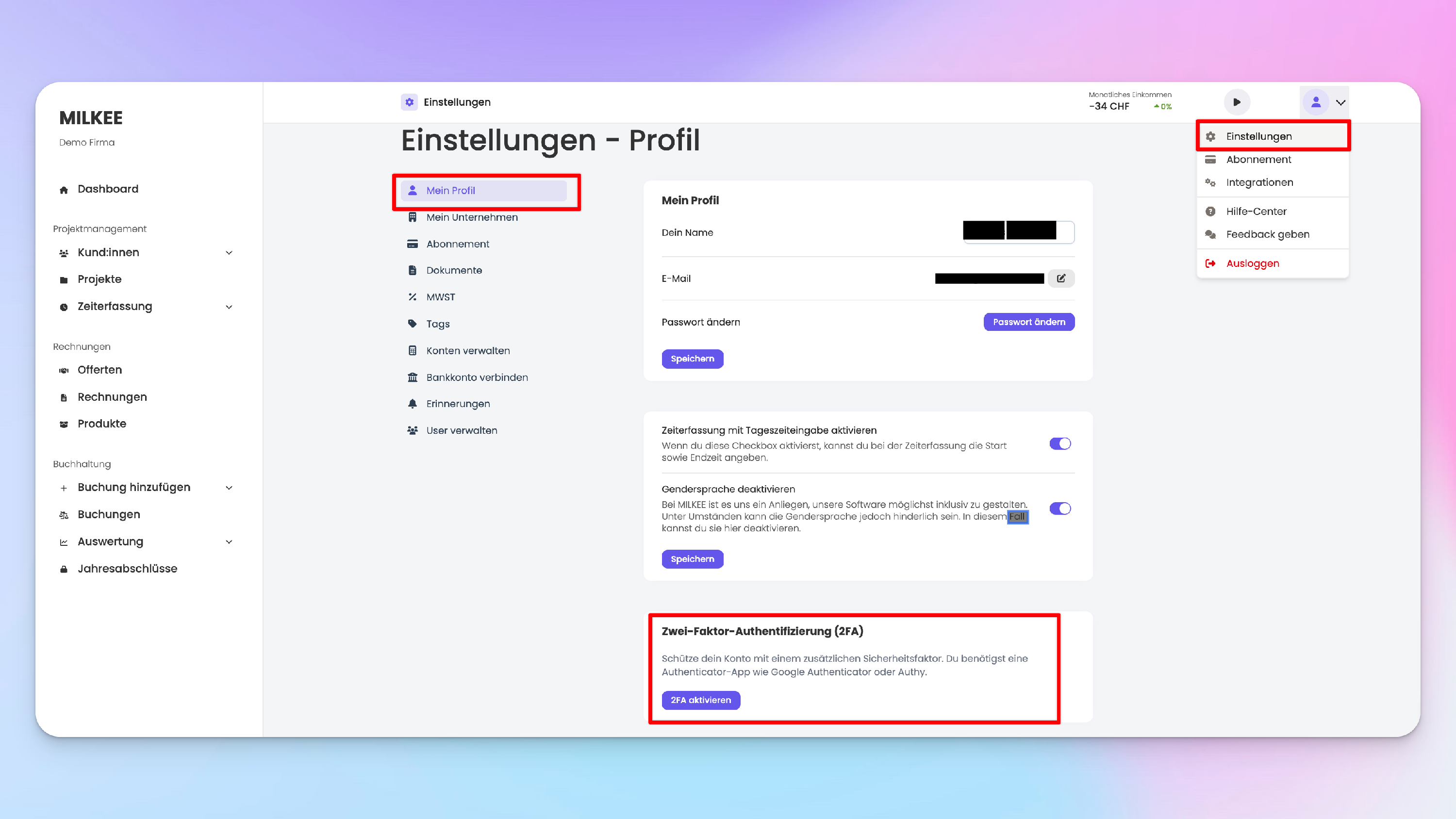 Navigiere hierfür zuerst in die Einstellungen -> Mein Profil und klicke dann auf «2FA aktivieren».