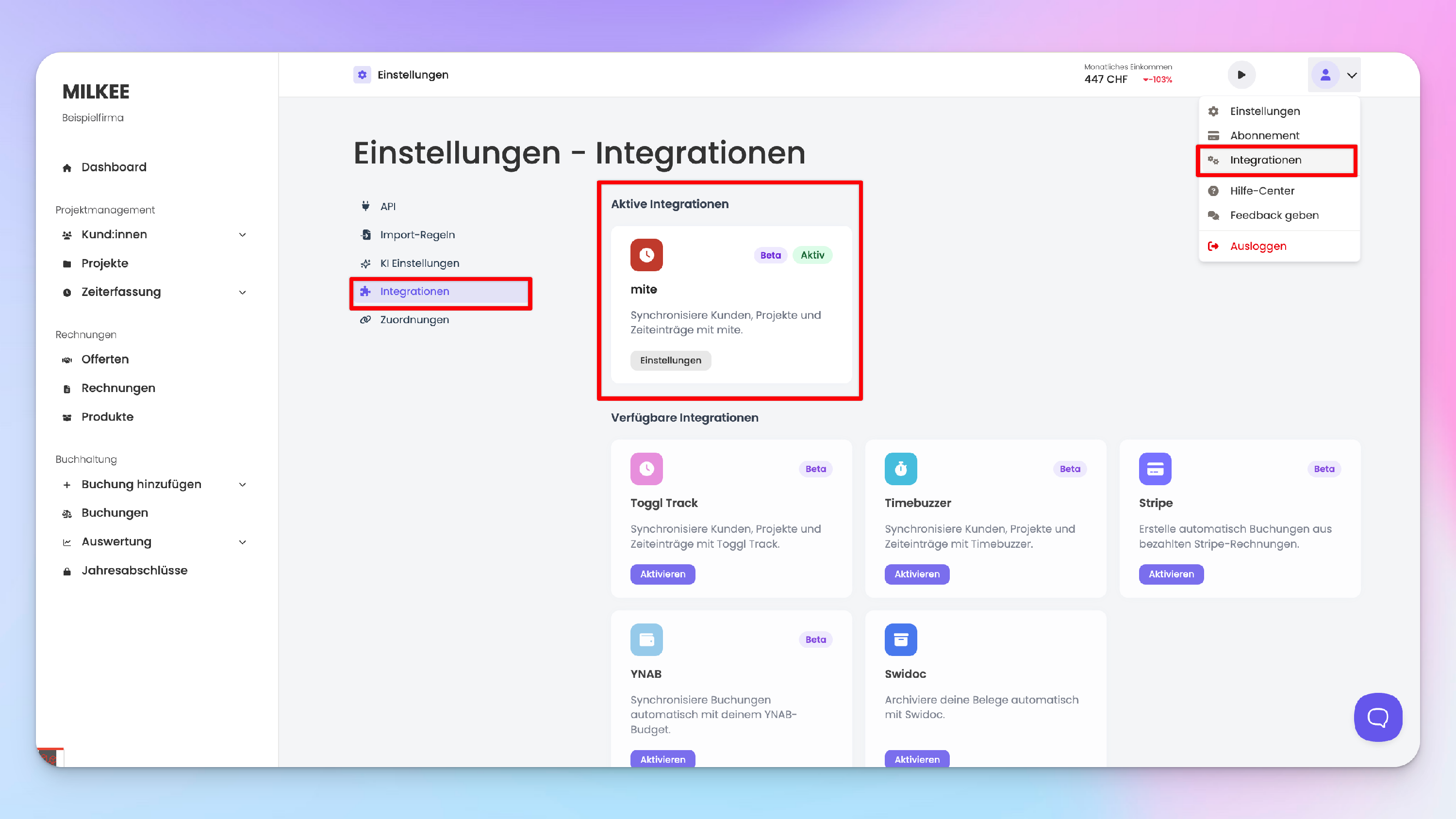 Mit der mite-Integration kannst du Kunden, Projekte und Zeiteinträge zwischen MILKEE und mite synchronisieren.
