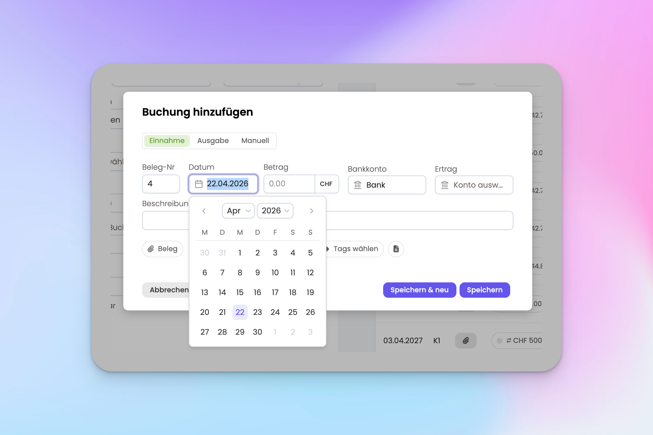Die Datumseingabe ist in der Buchhaltung eines der wichtigsten Felder. Daher haben wir einige Shortcuts und Hilfestellungen eingebaut, die dir helfen, das korrekte Datum schneller einzugeben.