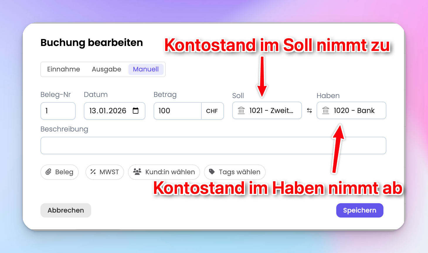In unserem Beispiel wäre der Kontostand vom Bankkonto 1020 - Bank (Haben) nach der Buchung also -100 Franken und der Kontostand vom Bankkonto 1021 - Zweites Konto (Soll) wäre +100 Franken.