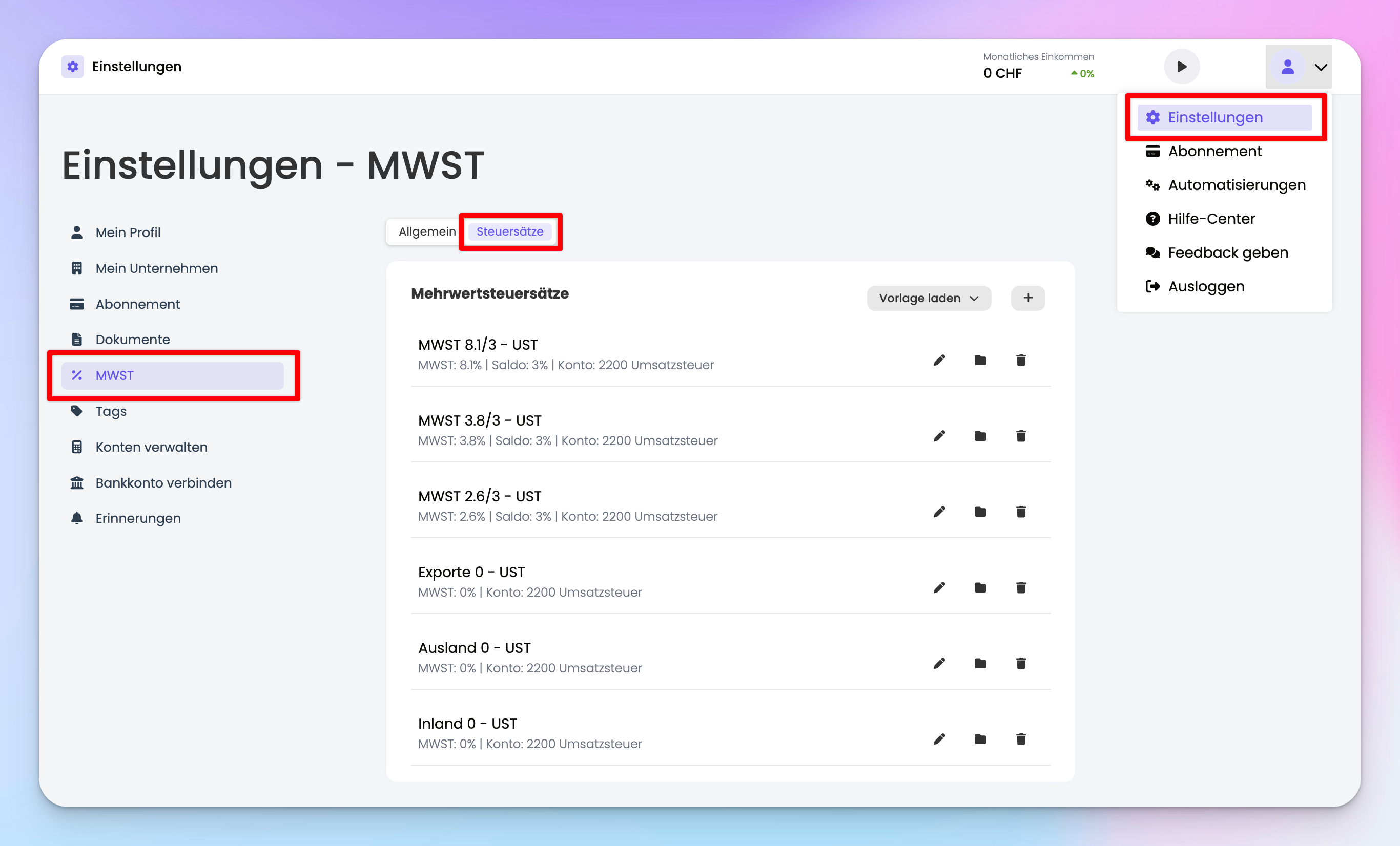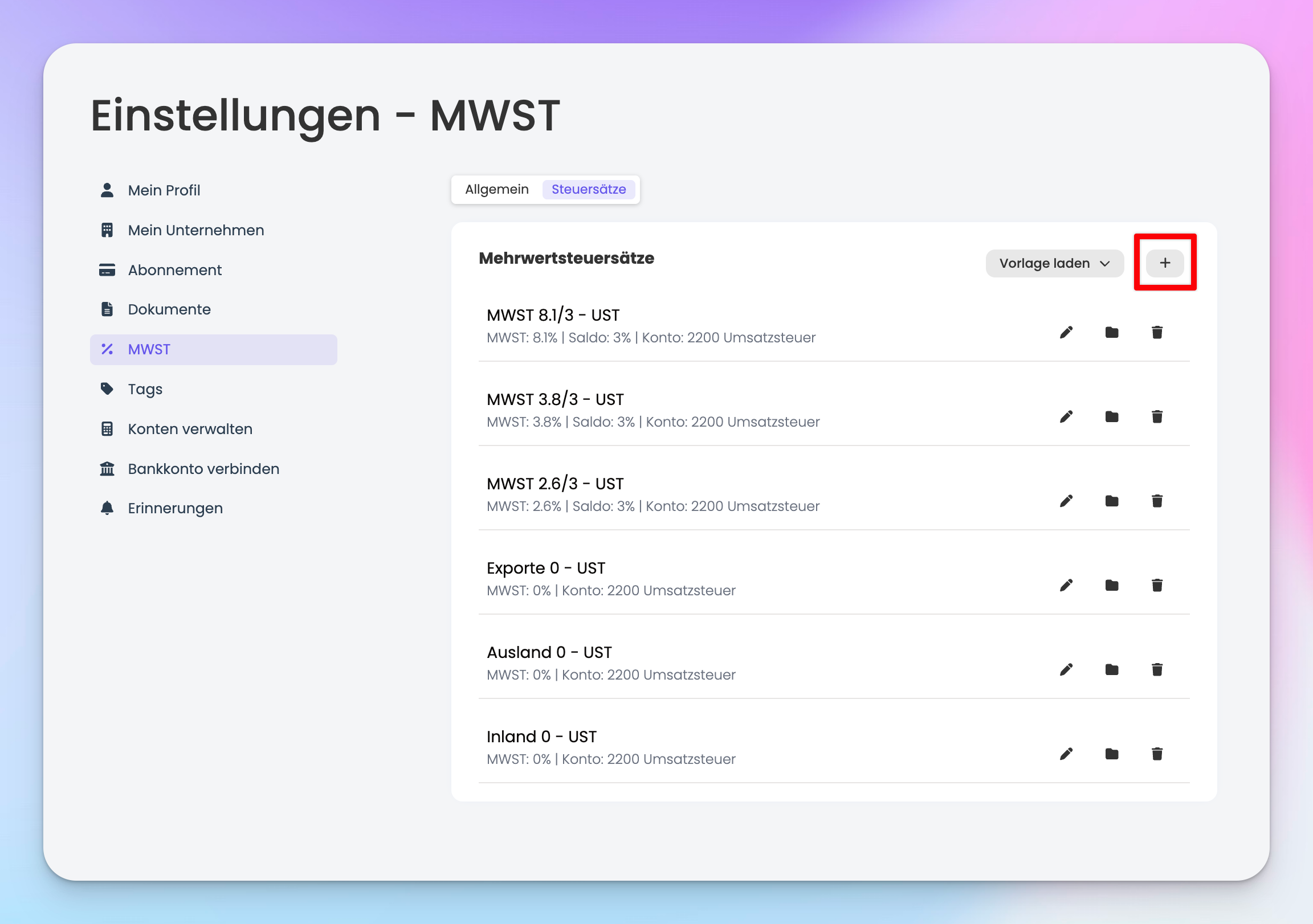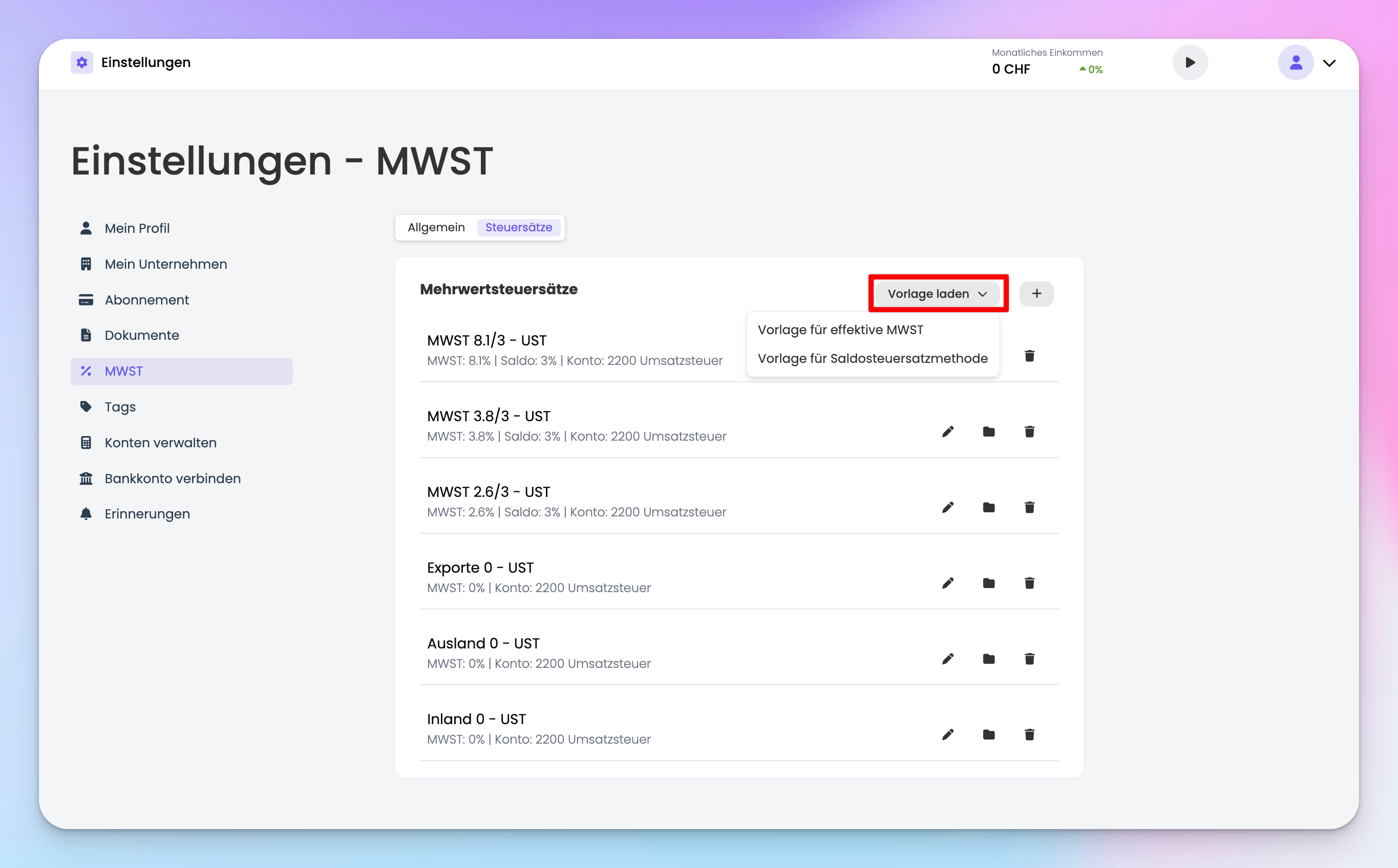 Du hast auch die Option, unsere Vorlagen für die effektive Abrechnungsmethode oder für die Saldosteuersatzmethode zu importieren. Klicke dazu in den Einstellungen auf MWST, dann auf «Steuersätze» und anschliessend auf «Vorlage laden».