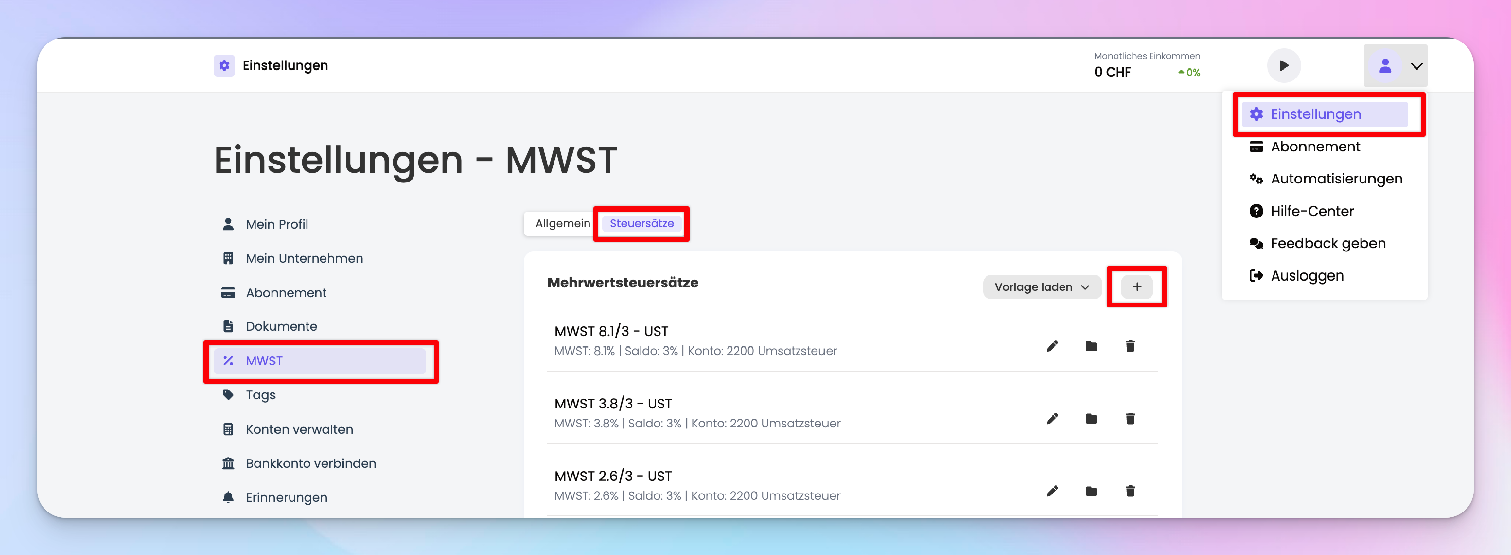Mit diesem Wissen können wir jetzt den Steuersatz in MILKEE erstellen. Navigiere dazu in die Einstellungen -> MWST -> Steuersätze: