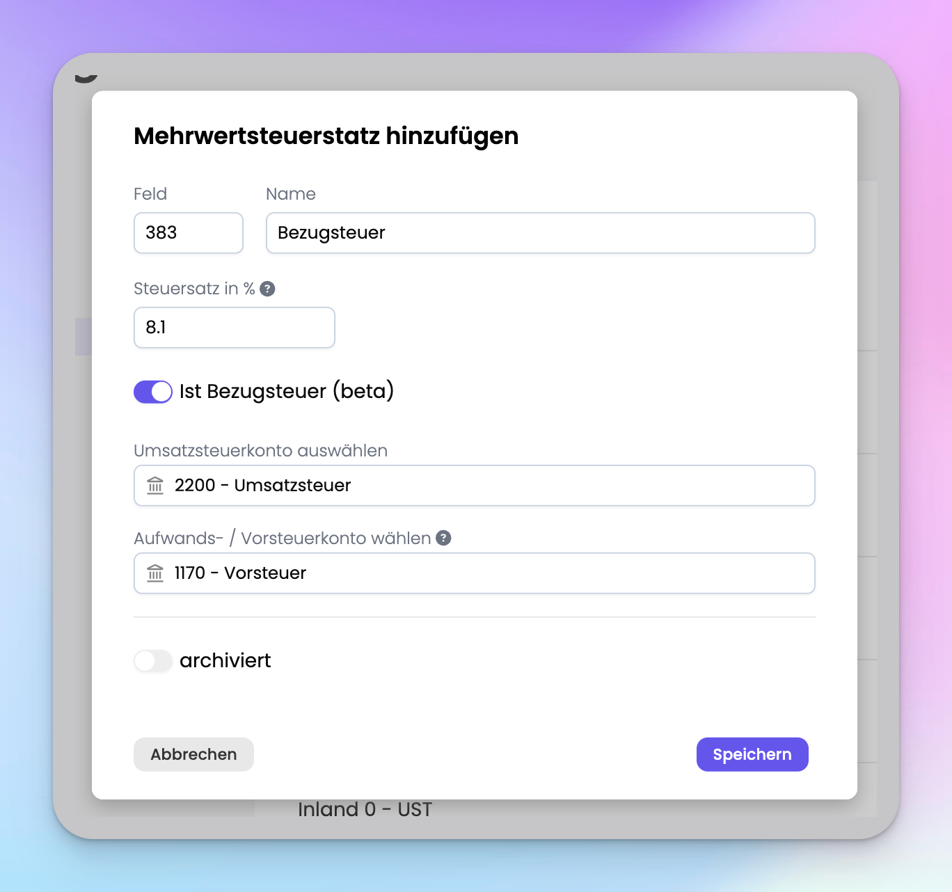 Dann noch speichern und du kannst den Steuersatz zukünftig bei deinen Buchungen auswählen. Bei Verwendung verbucht er immer 8.1% des Betrages auf das Vorsteuerkonto und gleichzeitig 8.1% des Betrages auf das Umsatzsteuerkonto.