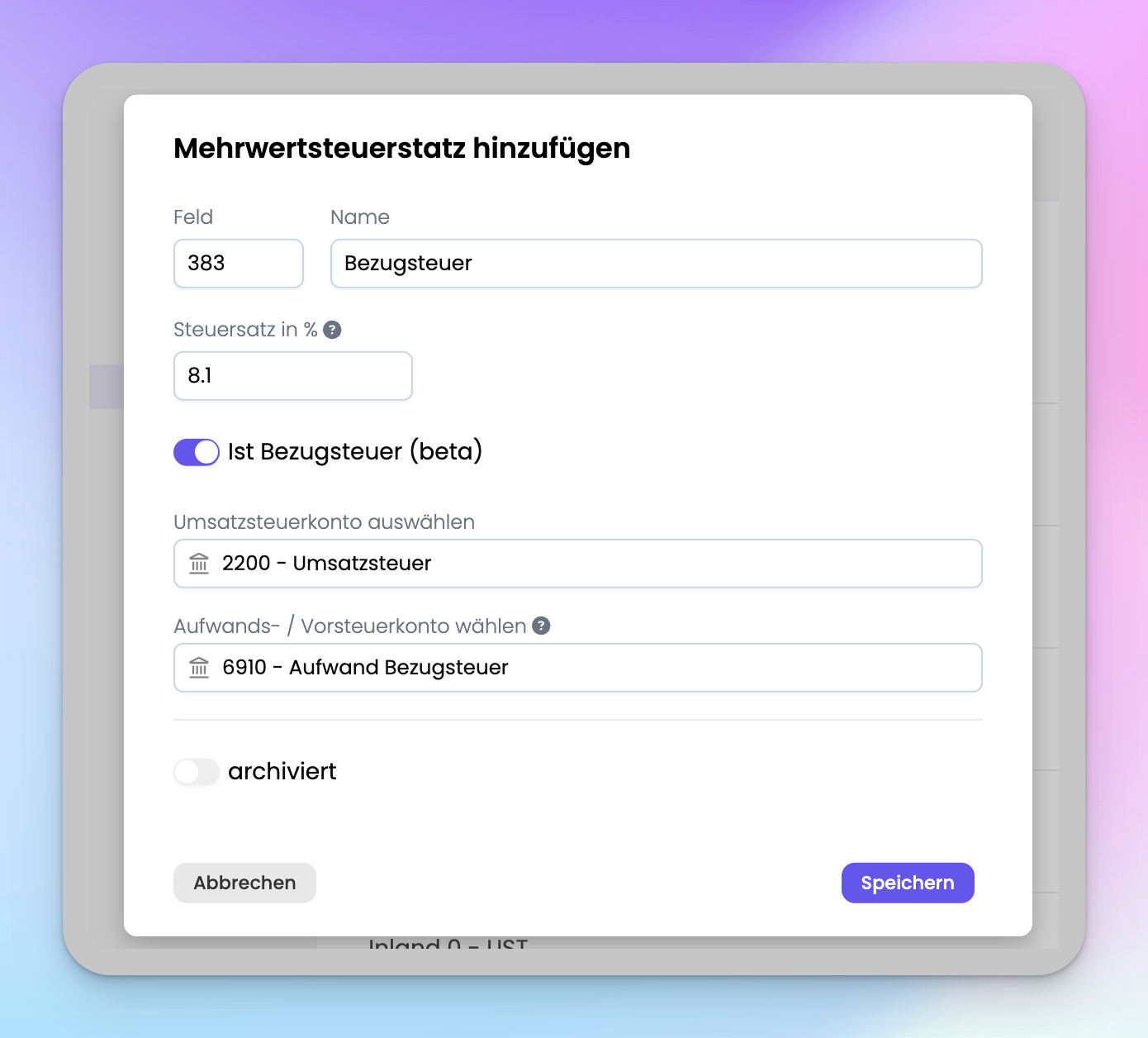 - Aufwands- / Vorsteuerkonto: 6910 Aufwand Bezugsteuer (muss erstellt werden)