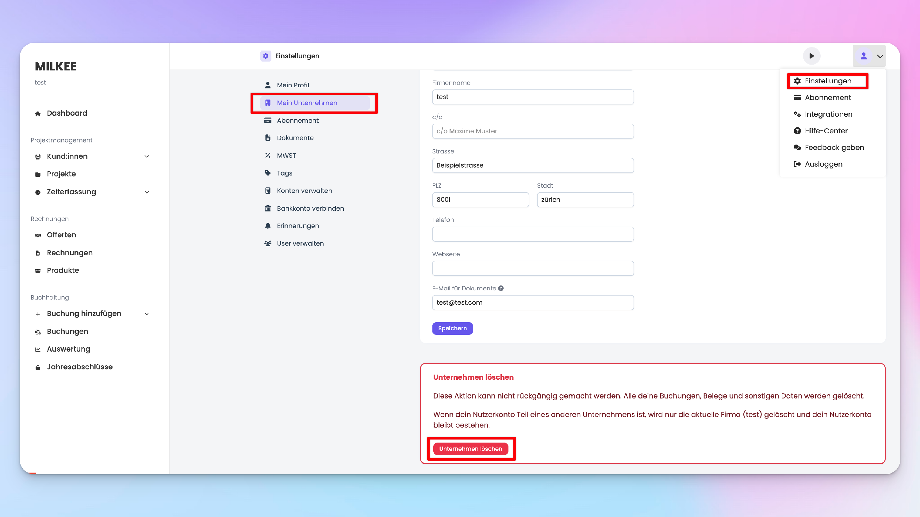 Wenn du dein Konto löschen willst, kannst du dies in den Einstellungen tun. Navigiere dazu in den Einstellungen zum Abschnitt «Mein Unternehmen» und scrolle dann ganz nach unten. Dort findest du die Option, dein Konto zu löschen.