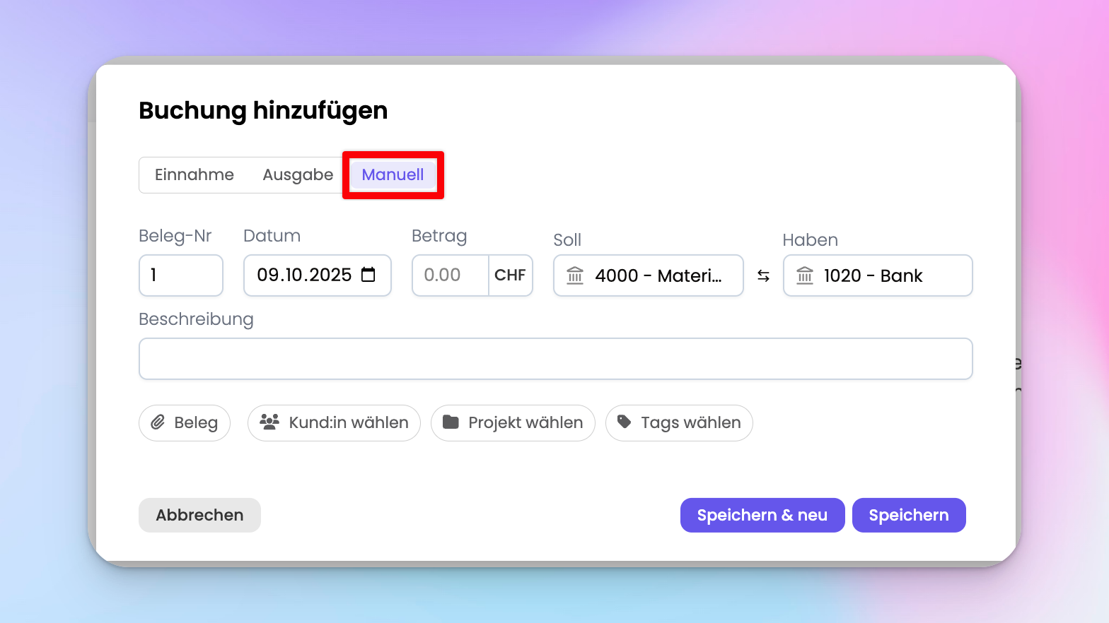 Im Grundsatz funktioniert die manuelle Buchung gleich wie Einnahmen oder Ausgaben. Die einzige Schwierigkeit ist das Soll- und Haben-Konto richtig auszuwählen. Warum das so heisst, keine Ahnung... Aber da sind wir halt bei der doppelten Buchhaltung angekommen und da heisst das nunmal so 🤷♂️