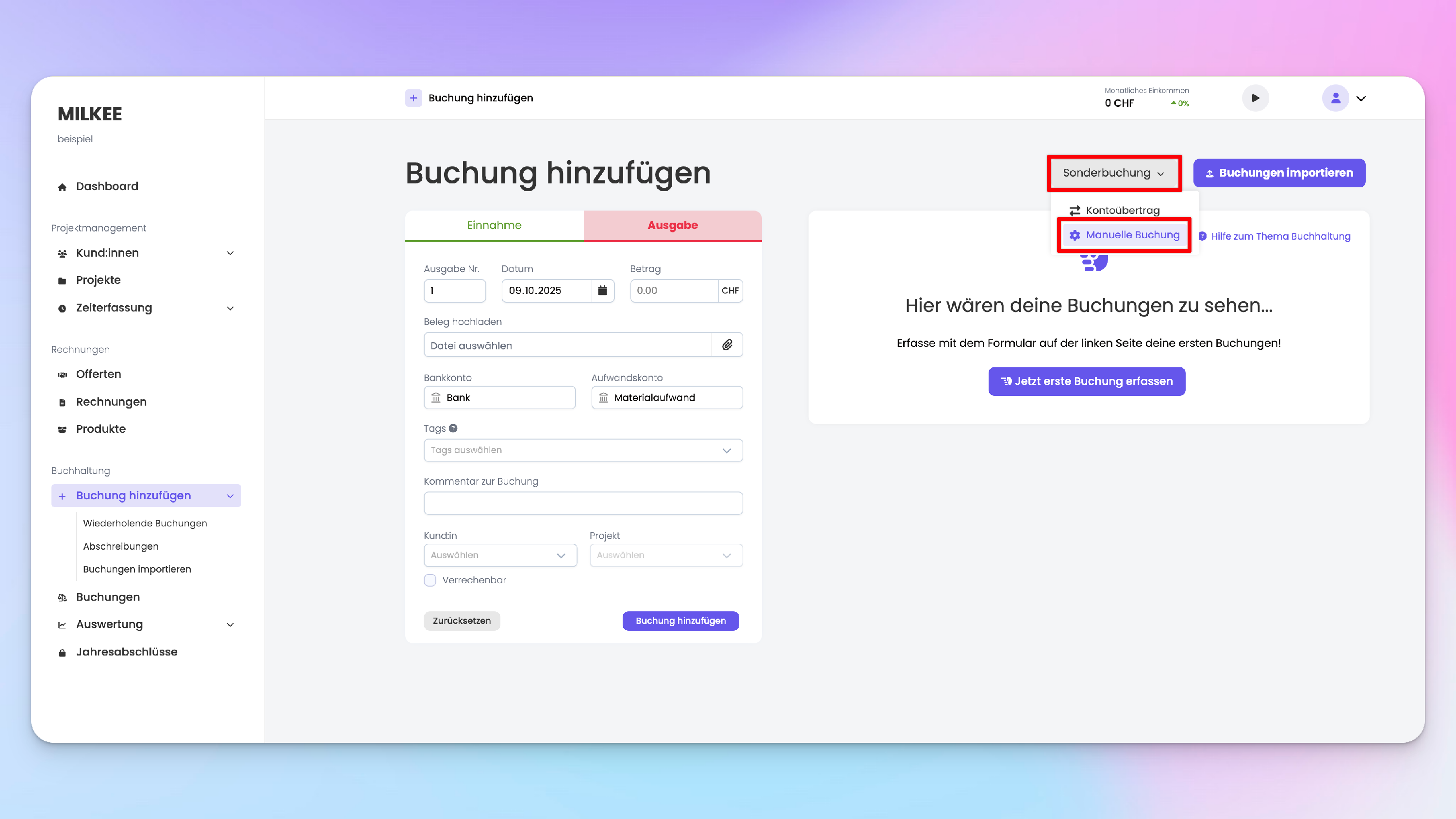 In MILKEE kannst du auch eine doppelte Buchhaltung führen. Dafür musst du früher oder später eine manuelle Buchung hinzufügen. Unter manuellen Buchungen verstehen wir alle Buchungen, die kein Ertrags und kein Aufwandskonto haben.