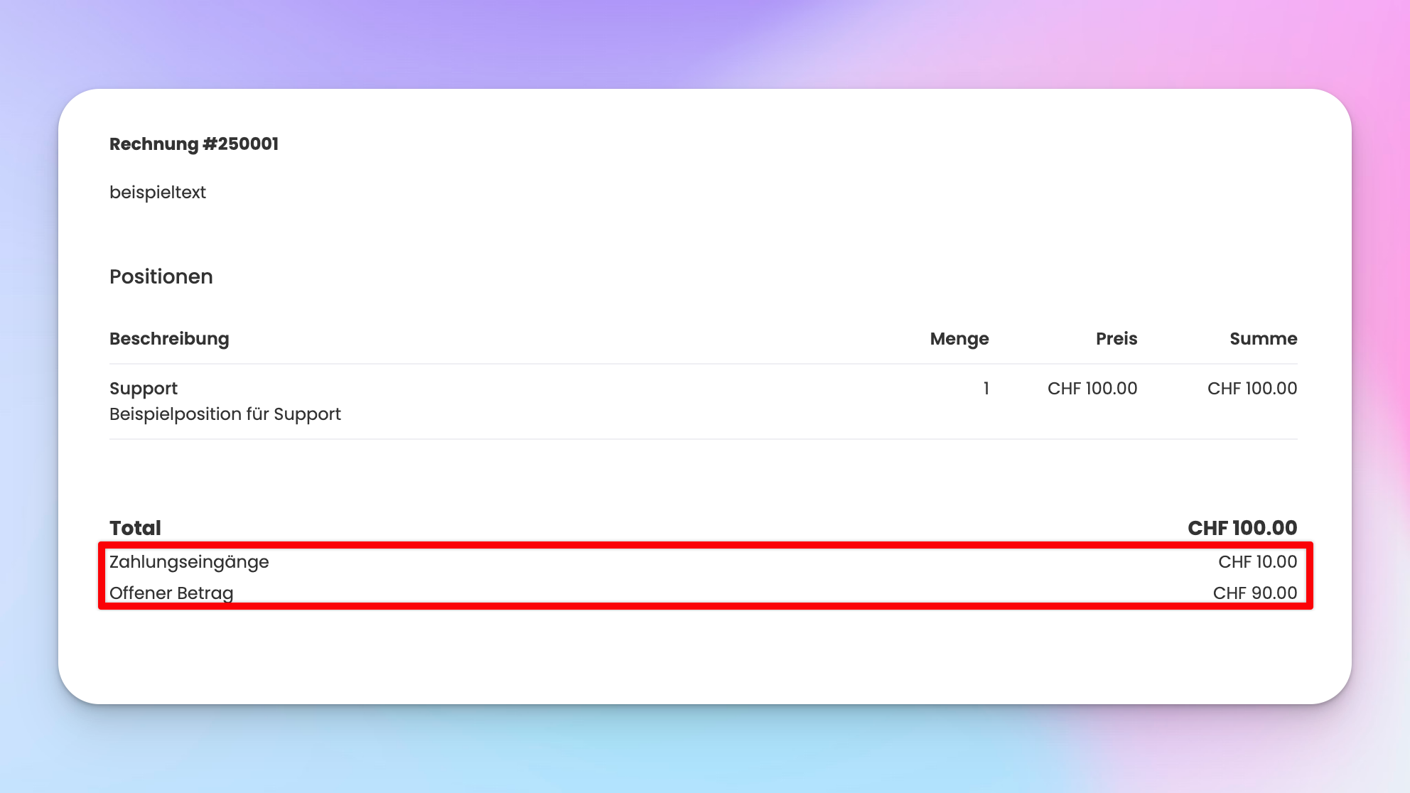 Standardmässig wird der offene Betrag nur in der Dokumentenvorschau, nicht aber im PDF angezeigt.