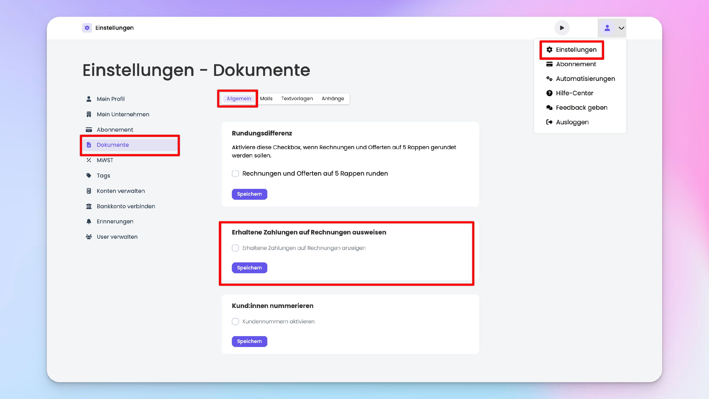 Du kannst in den Einstellungen die Option aktivieren, dass die Zahlungseingänge auch auf dem PDF ausgewiesen werden. Navigiere dazu in die Einstellungen -> Dokumente -> Allgemein und aktiviere die Option «Erhaltene Zahlungen auf Rechnungen ausweisen».