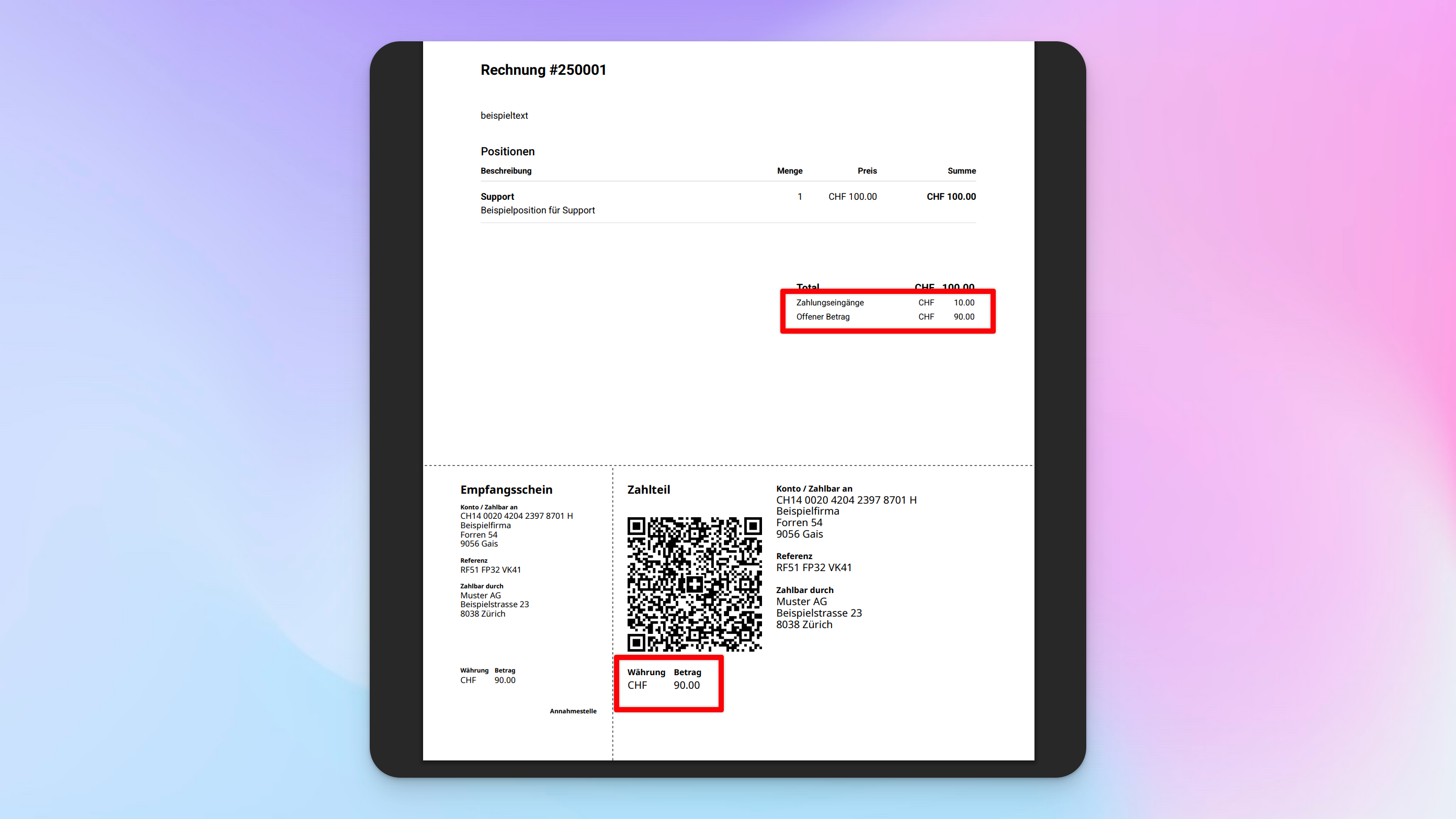 Danach werden im PDF unter dem Total die Zahlungseingänge ausgewiesen und der Rechnungsbetrag im QR-Code passt sich automatisch zum offenen Betrag an: