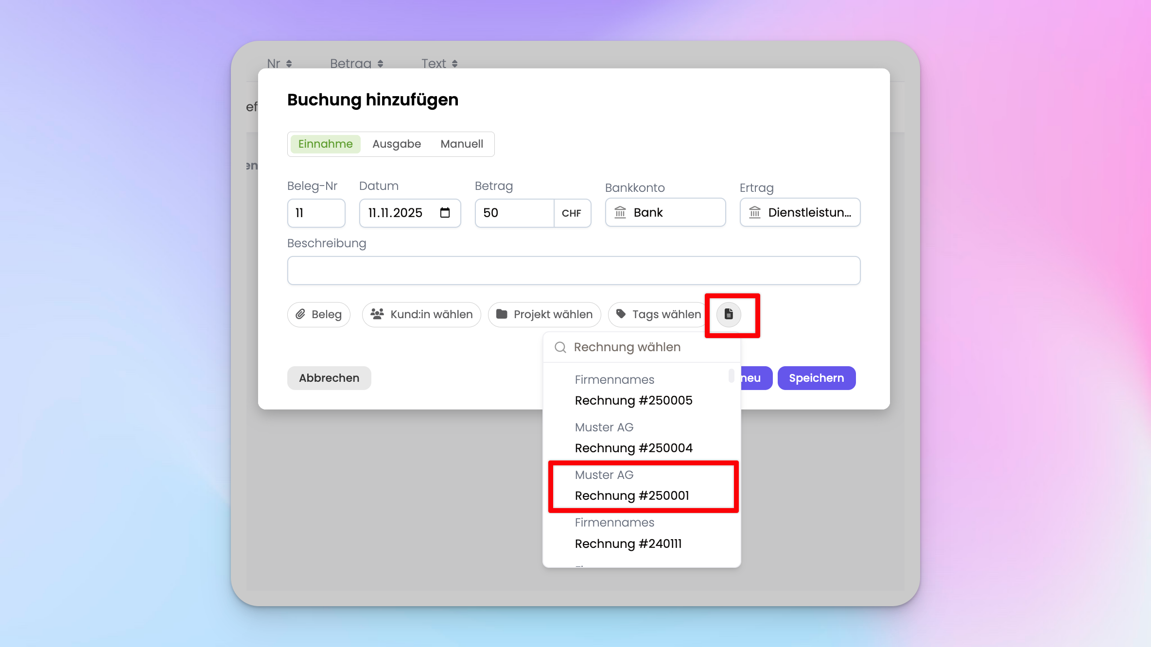 Einnahme an Rechnung zuweisen