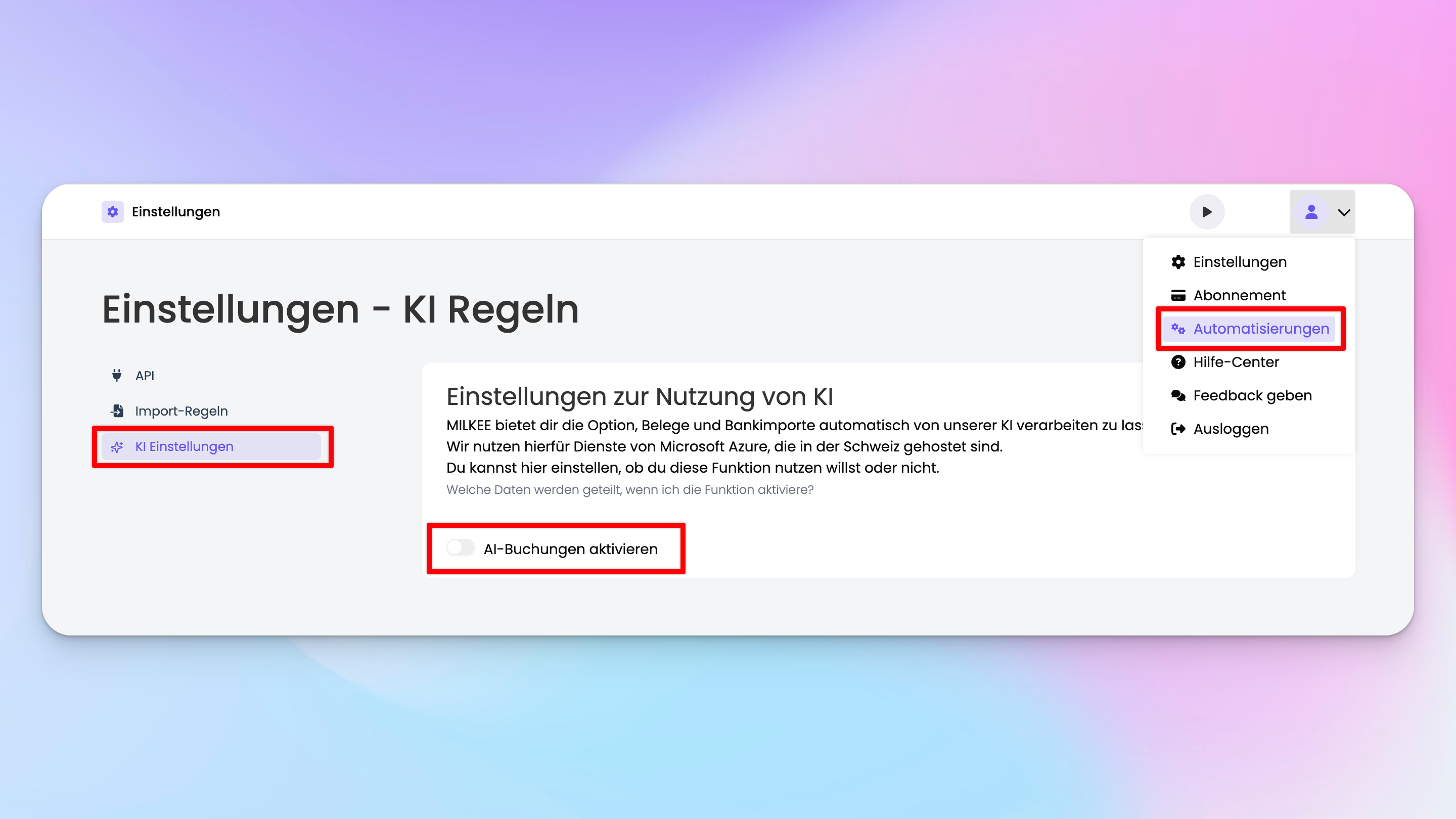 Damit du die KI-Funktionen nutzen kannst, musst du sie in den Einstellungen aktivieren. Klicke dazu auf Automatisierungen -> KI-Einstellungen und aktiviere dann «AI-Buchungen».