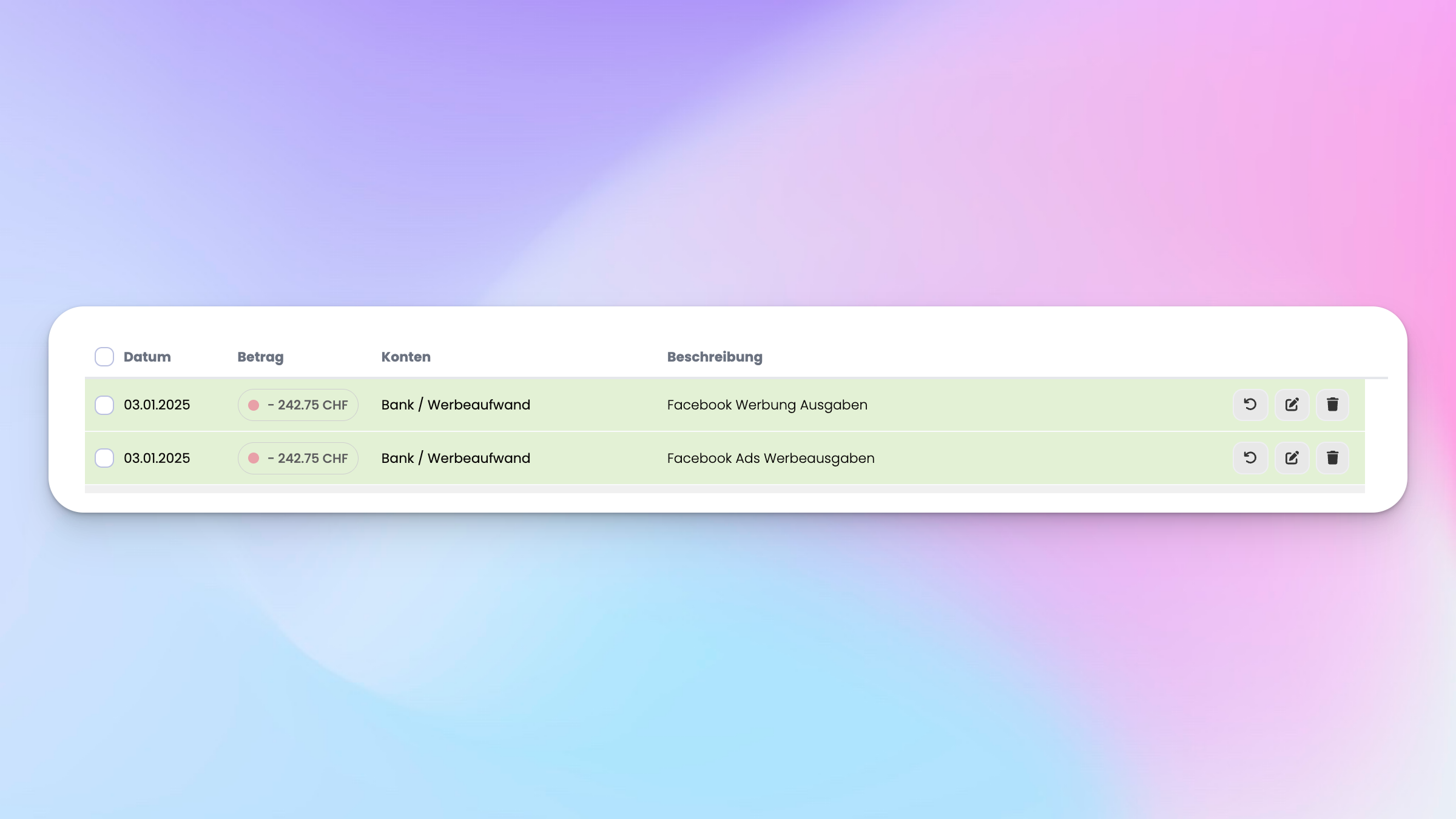 Die Buchungsvorschläge werden mit jedem Import besser und genauer auf deine Firma angepasst. Kontrolliere also gut, ob die Vorschläge Sinn ergeben.